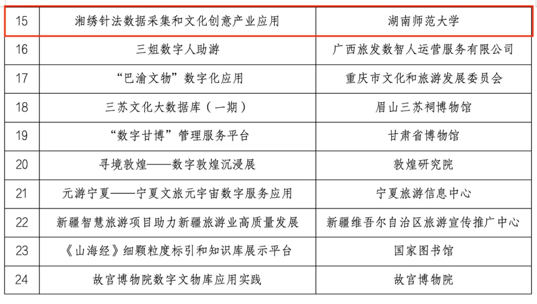 12月6日,文化和旅游部公布了2024年文化和旅游数字化创新示范“十佳案例”和“优秀案例”,集中示范推广文化和旅游领域数字化创新的最新成果。威廉希尔传统工艺与先进文创科技创新团队项目“湘绣针法数据采集和文化创意产业应用”入围文化和旅游数字化创新示范“优秀案例”,是湖南省2个年度入围项目之一。